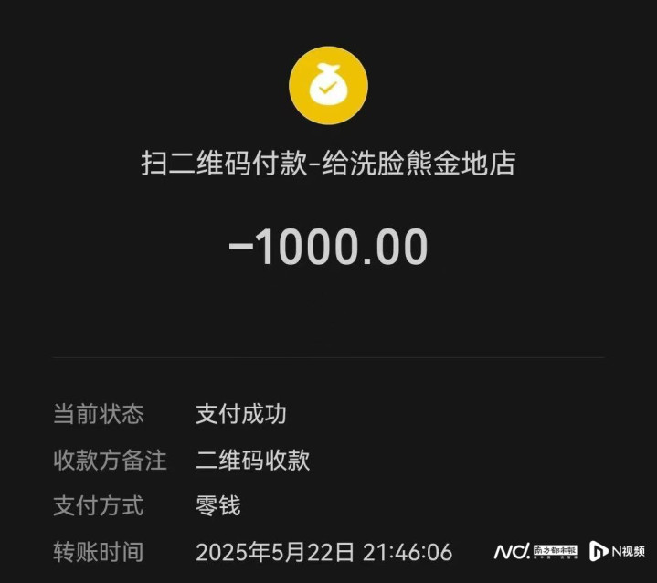 吴小姐提供的截图显示,她于今年5月22日向洗脸熊金地店付款了1000元,8月28日,她收到了198元的退款。
