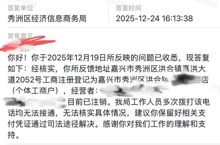 陈小姐表示,她就此事报案了,但公安局让她找市场监管部门。据她提供的12315平台的投诉反馈,属地嘉兴市秀洲区经济信息商务局于12月24日回复称,经核实,陈小姐投诉的美容店经营者的联系电话目前已注销,该局工作人员多次拨打该电话均无法接通,无法核实具体情况,建议陈小姐保留好支付凭证通过司法途径解决。