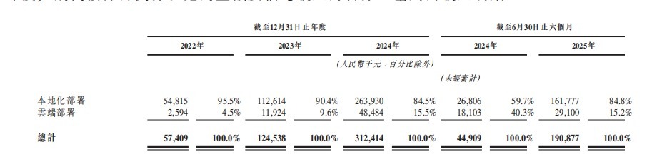 智谱AI的收入主要来自通过MaaS平台(模型调用服务)提供大模型服务,即通过API调用向开发者和企业输出通用AI能力。其中,大模型本地化部署是公司的支柱性营收,2022年,该业务营收占比达95.5%;2025年上半年,营收比重降至84.8%,同期公司云端部署业务营收比重提高至15.2%。